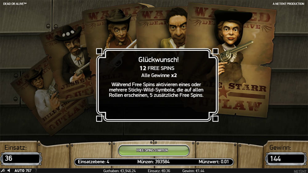 Der Spielehersteller NetEnt ist jedem Casino Fan wohl ein Begriff. Mit dem Dead or Alive Slot hat es der Entwickler geschafft, einen ausgezeichneten Western Slot zu produzieren. Grundsätzlich ist NetEnt bekannt für die hervorragende Qualität ihrer Produkte und schon seit mehr als zehn Jahren auf dem Online Casino Markt tätig. Sowohl die grafische Umsetzung des Western Themas ist hervorragend gelungen, aber auch der Spaßfaktor kommt nicht zu kurz. In einem Dead or Alive Online Casino erwartet dich mit Sticky Wilds, Freispielrunden, Multiplikatoren und einer guten Auszahlungsquote ein Slot, der hervorragend aufgestellt ist, und die Spannung während des Spiels aufrecht erhält.