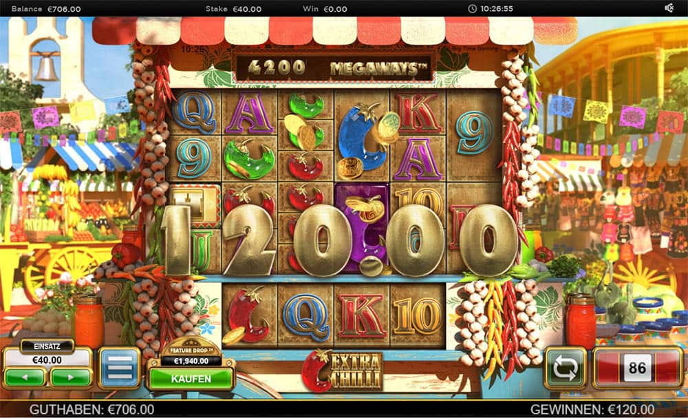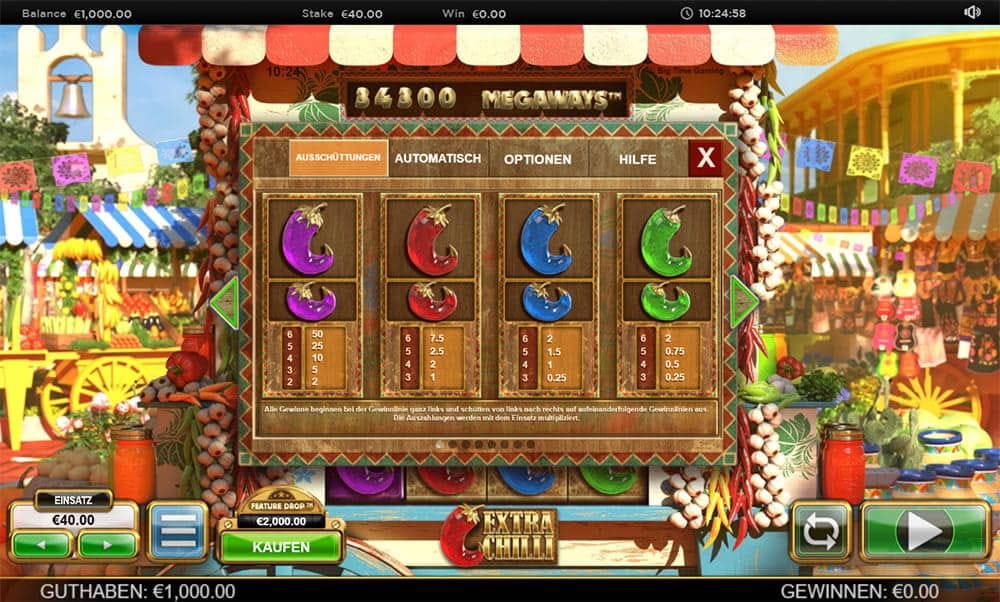 - Der Spielautomat Extra Chilli zählt zu den Slots die nicht nur für Spieler mit “normalen” Einsätzen geeignet sind sondern auch High Roller können damit ihre Freude haben. Maximal kann 1€ pro Spin eingesetzt werden.