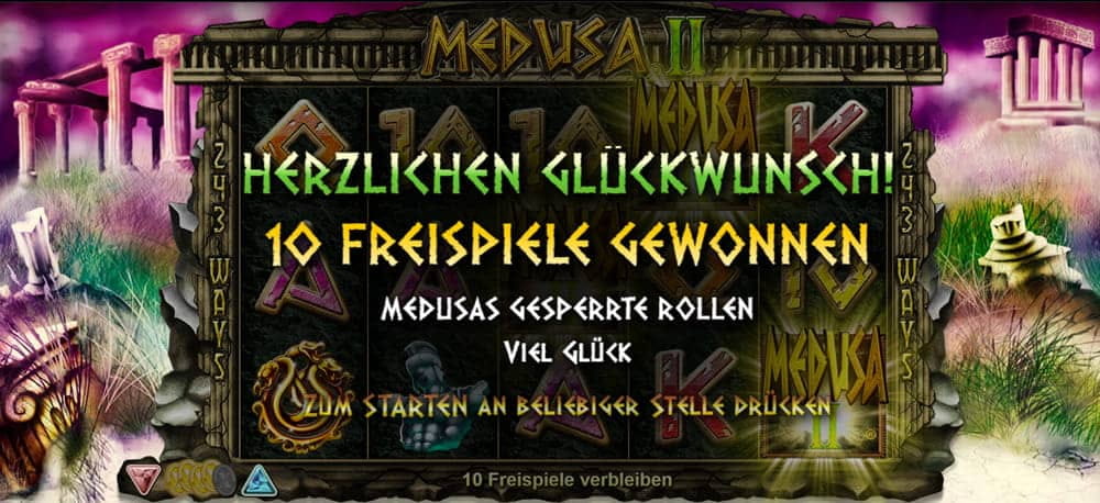 Wer einmal den Kampf gegen Medusa aufgenommen hat, wird wissen, dass es eine Weile benötigt, um diese fürchterlich schöne Dame zu schlagen. Zum Glück stehen dir als Spieler – während der Bonusrunden – der ein oder andere Free Spin zur Verfügung. Drei oder mehr Scatter-Symbole, die den Schriftzug Medusa 2 darstellen, lösen zehn Freispielrunden aus. Während dieser Runden fixieren sich 2 – 5 benachbarte Walzen miteinander und ermöglichen dir so noch größere Gewinnwahrscheinlichkeiten. Solltest du fünf Freirunden gewinnen, kannst du dich über weitere Freispiele freuen.