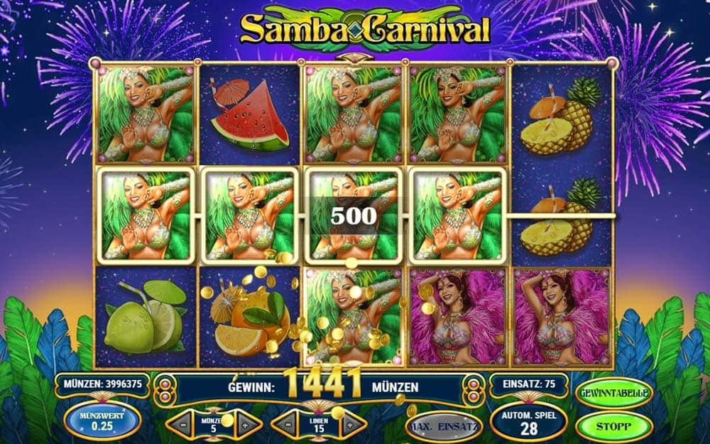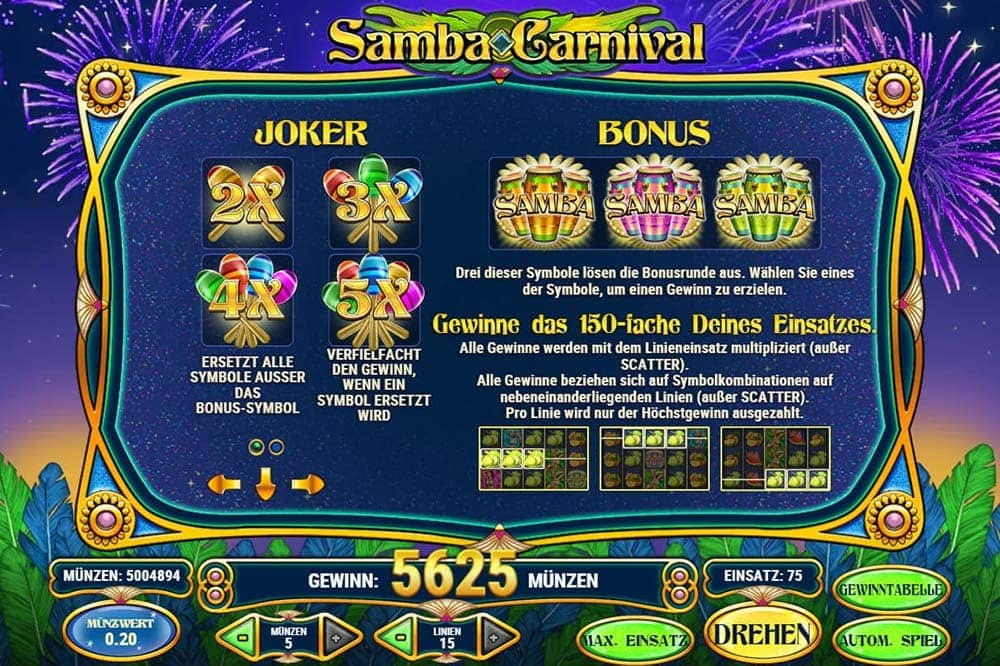 • Jedes Online-Casino bietet dir einen Willkommensbonus an, den du auch für Samba Carnival nutzen kannst. Zusätzliche Boni und Freispiele kommen in vielen Fällen noch hinzu.